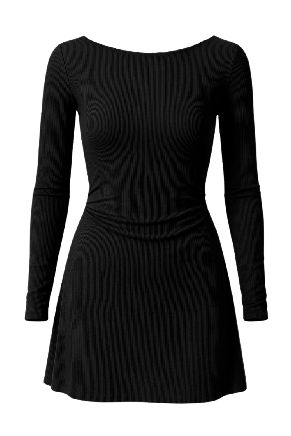 Vestido corto canalé de fit ajustado, manga larga, cuello barco, plisados laterales en cintura y corte en a.